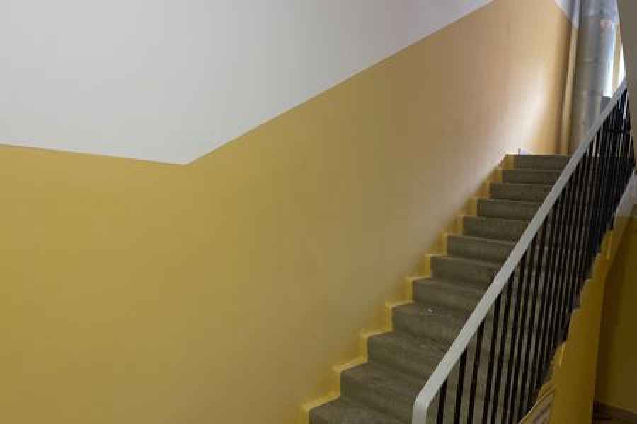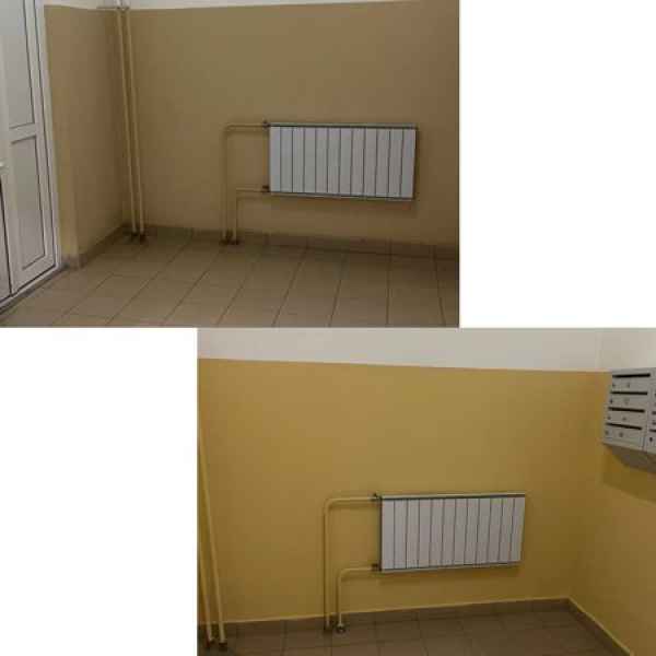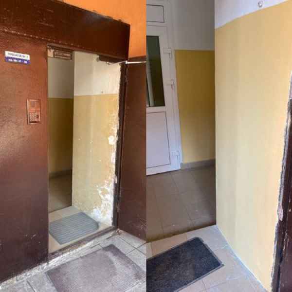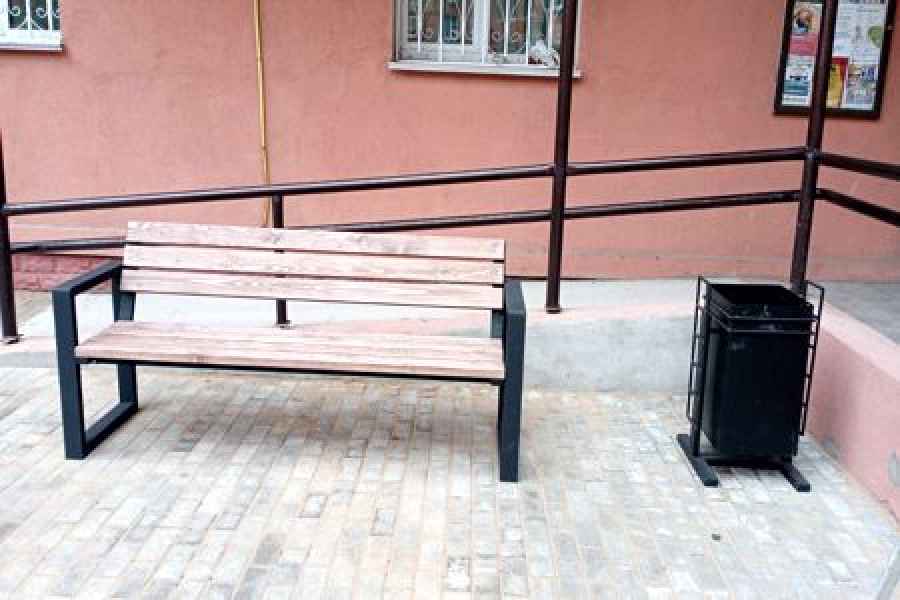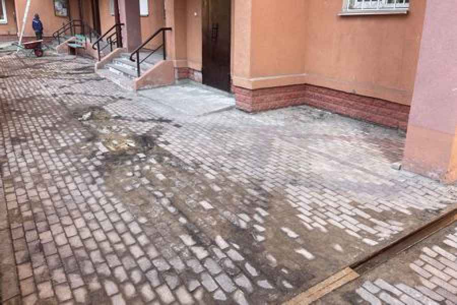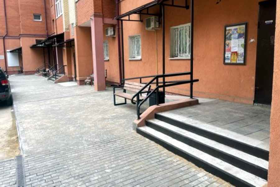 Были отремонтированы входные группы, покрашены первые этажи подъездов. Установлен пандус для малоподвижной категории граждан. Произведен демонтаж старой брущатки на новую. Заменены уличные скамейки и урны на современный дизайн.