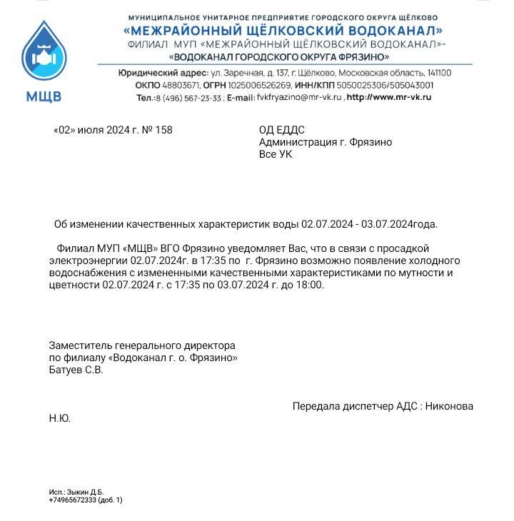 Сообщаем вам, что, в связи с понижением напряжения в электросетях, возможно появление холодного водоснабжения с измененными качественными характеристиками по мутности и цветности.