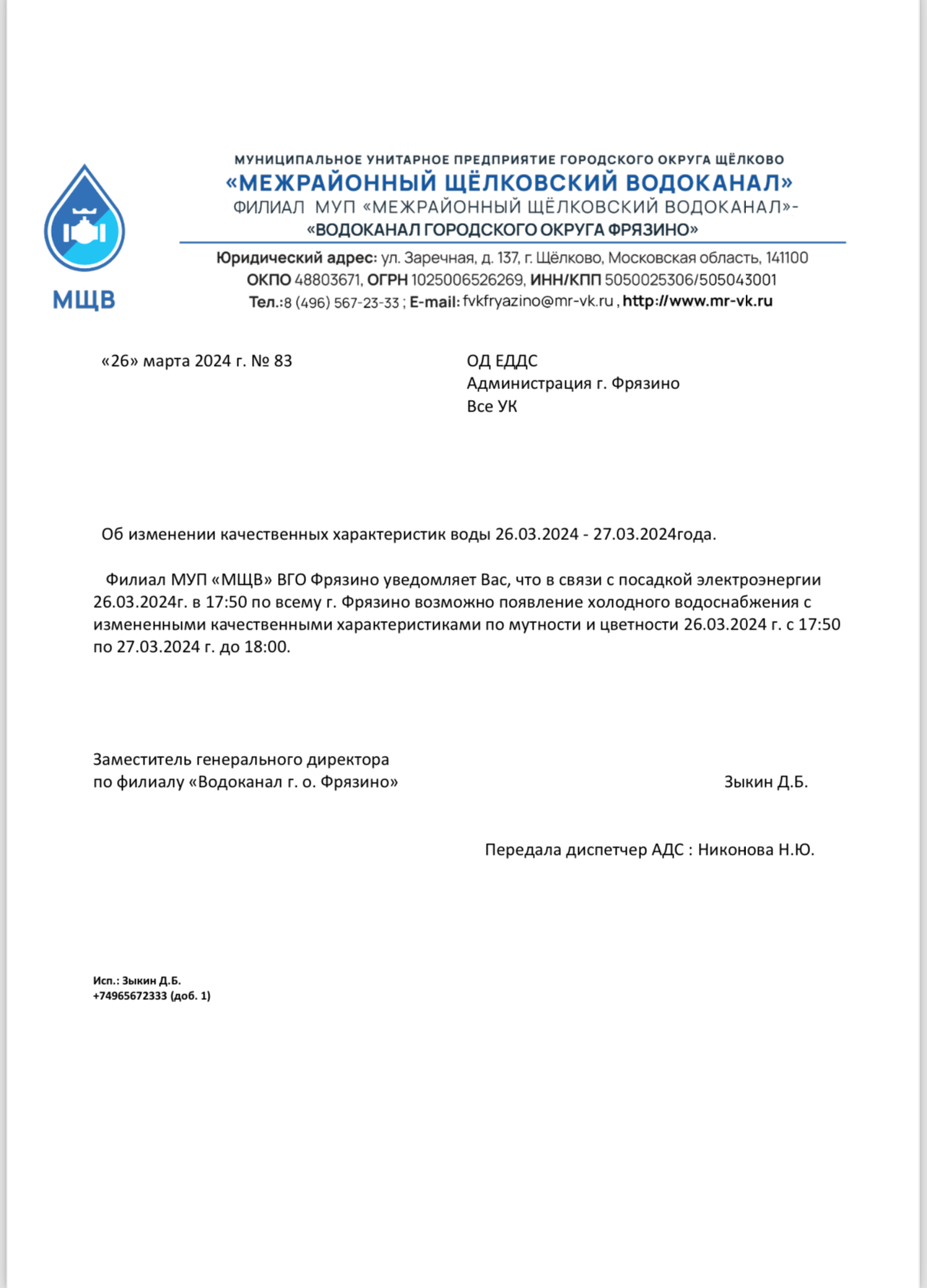 Сообщаем вам, что, в связи с понижением напряжения в электросетях, возможно появление холодного водоснабжения с измененными качественными характеристиками по мутности и цветности.