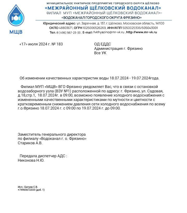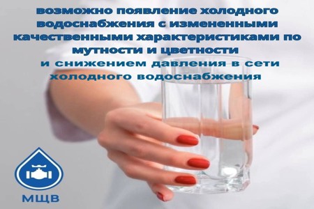 Сообщаем вам, что, в связи с понижением напряжения в электросетях, возможно появление холодного водоснабжения с измененными качественными характеристиками по мутности и цветности, а также понижением давления в системе холодного водоснабжения.