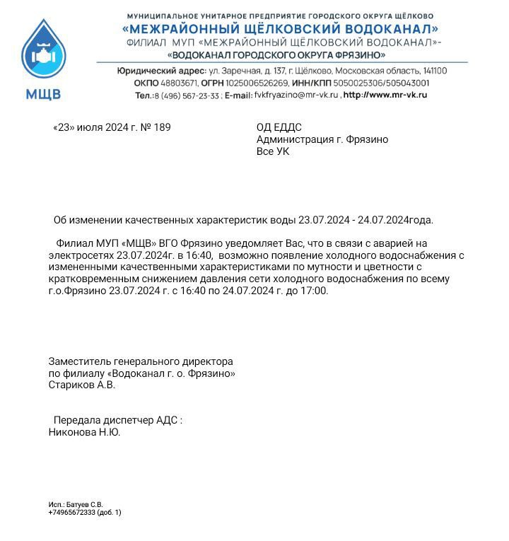 Сообщаем вам, что, в связи с понижением напряжения в электросетях, возможно появление холодного водоснабжения с измененными качественными характеристиками по мутности и цветности, а также понижением давления в системе холодного водоснабжения.